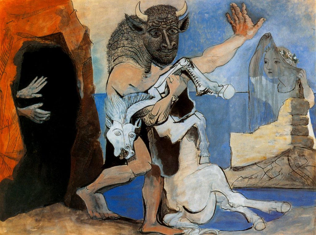 Dans La Corrida (1934), l’union du taureau et du corps humain rejoue la mêlée érotique et violente de la peinture elle-même. Et dans la série du Minotaure, le mythe devient autoportrait : l’artiste-monstre se débat entre pulsion destructrice et désir d’éterniser le corps aimé.