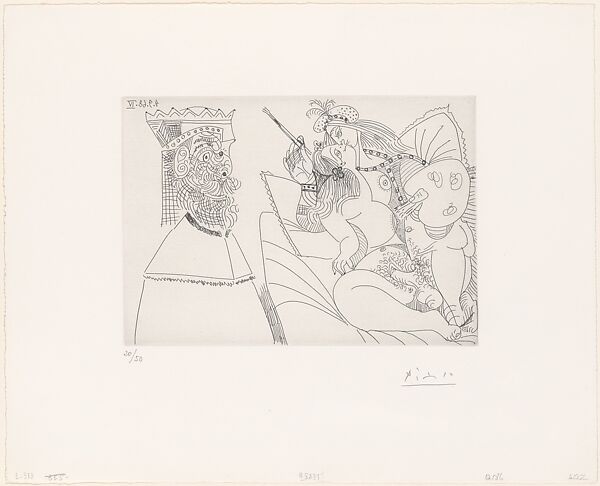 La dimension ludique et ironique n’est jamais absente. Dans les gravures de Raphaël et la Fornarina, Picasso réécrit la relation entre le maître et sa maîtresse en y glissant des témoins indiscrets – papes, enfants, spectres d’artistes. Ces figures comiques incarnent le regard extérieur, comme si le voyeurisme faisait partie intégrante du processus créateur. Peindre revient ici à « voir en voyant », dans un échange d’exhibitions réciproques : la femme se montre, l’artiste s’expose à travers elle. La peinture devient alors l’espace d’une transgression joyeuse où désir, humour et invention s’entrelacent.