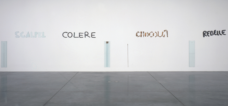 Dans les Partitions, Pane transfère le corps dans la matière, suggérant sa présence plutôt que de l’exposer directement. Les empreintes des mains dans le plomb et les photographies de mains blessées intégrées au verre prolongent son corps dans les matériaux. Rythmée par des formes et des mots sculptés – scalpel, colère, chocolat, rebelle – cette œuvre sollicite les sensations du spectateur et fait écho à sa posture. Mots de mur, partition pour un voyant synthétise la pratique de Pane tout en constituant un autoportrait, où métaux et verre incarnent le corps de l’artiste dans la matière.
