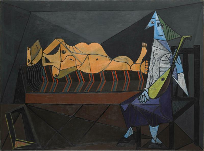 La composition s’inspire de modèles célèbres comme la Vénus d’Urbino du Titien ou L’Odalisque et l’esclave d’Ingres. Picasso reprend également l’idée de la femme nue écoutant la musique. Mais l’atmosphère de harem ou de sensualité disparaît totalement. À la place, l’artiste crée un climat d’incarcération et de cruauté. La « Vénus » à la chevelure tombante évoque presque un cadavre étalé, tandis que la musicienne, aux formes acérées, semble jouer le rôle de geôlière. Picasso transforme un thème traditionnellement léger en une image de tension psychologique.