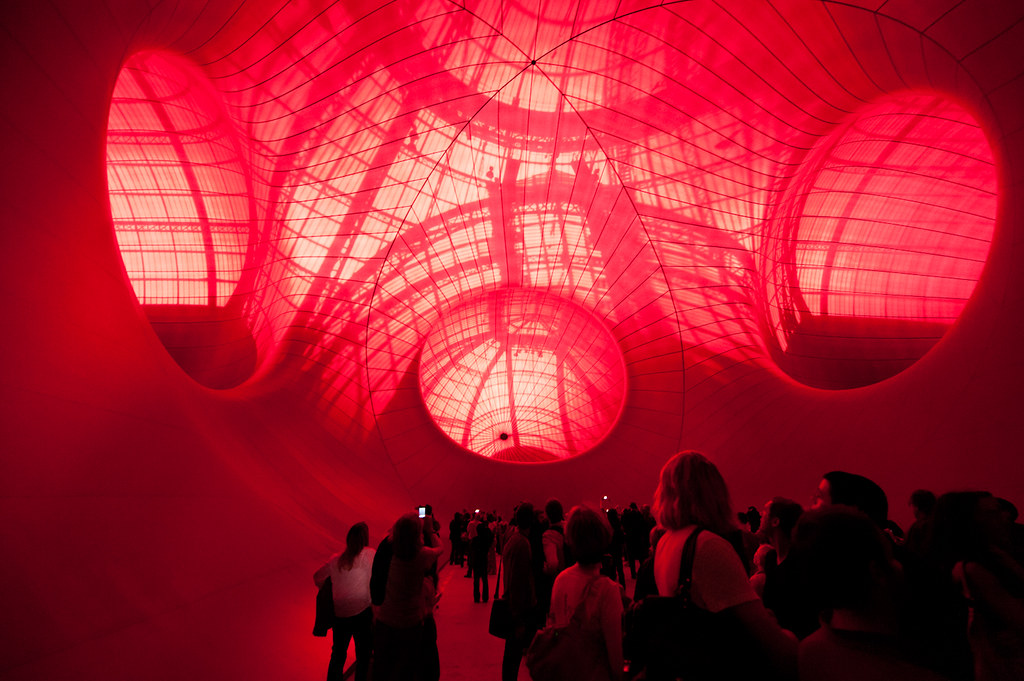 Cette installation gigantesque prend la forme d’une structure gonflable composée de trois volumes sphériques rouges, qui envahissent littéralement l’espace de la nef. Par son échelle monumentale, Leviathan instaure une relation physique intense avec le spectateur : celui-ci peut circuler autour de la sculpture, mais aussi pénétrer à l’intérieur. Kapoor joue ici sur une double sensation, entre domination et absorption : face à l’immensité de l’œuvre, le corps humain paraît minuscule, presque englouti, tout en étant invité à s’immerger dans cet espace.